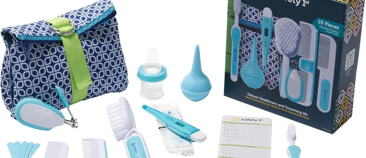 The Safety 1st Deluxe Healthcare & Grooming Kit is a great set of newborn baby essentials. This all-in-one newborn grooming kit comes with everything you need for baby grooming, whether it’s for a newborn boy or girl. This baby grooming kit includes an easy-grip brush with soft bristles and a…
