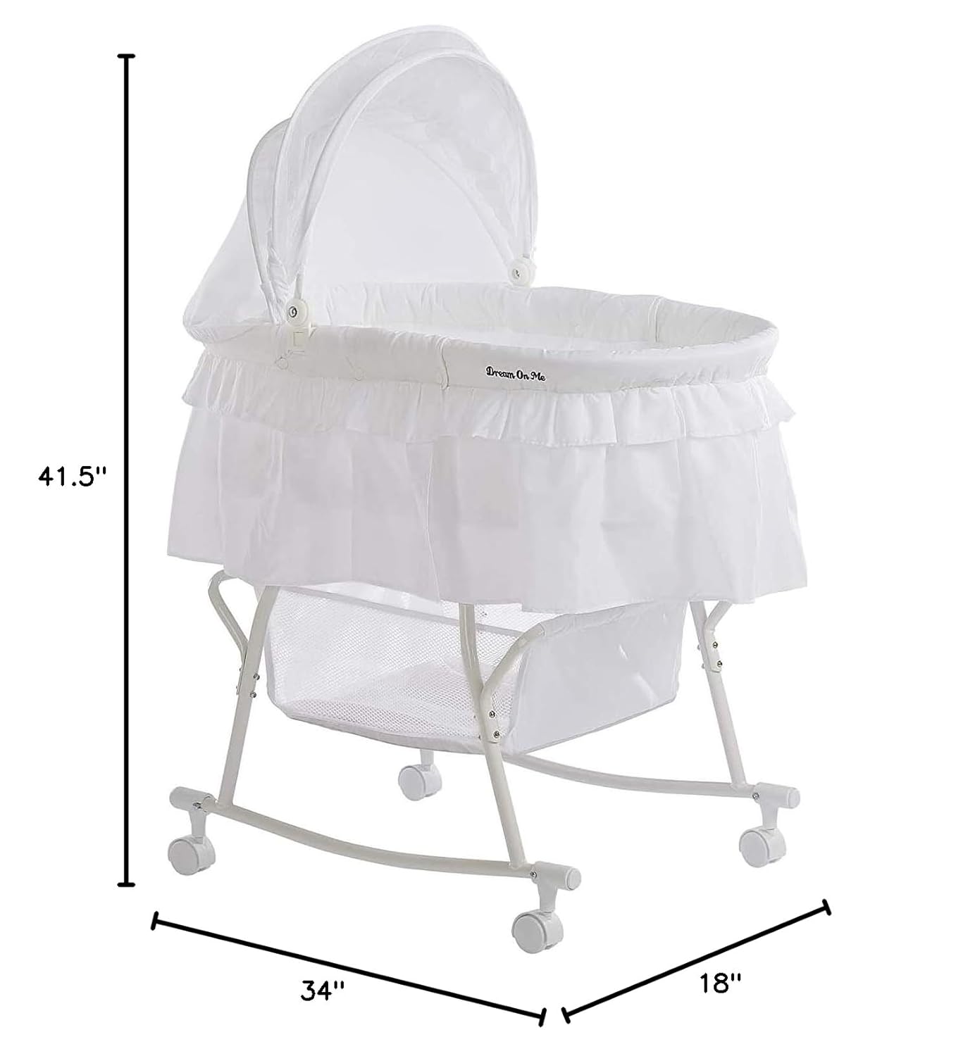 Dream On Me Lacy Portable 2-in-1 Bassinet & Cradle with Full Canopy, Storage Basket, Locking Wheels, Lightweight Frame, BSA Certified, Includes 1” Mattress Pad – White