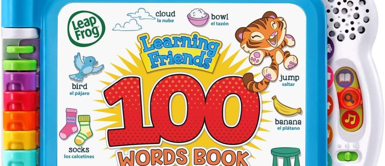 Join animal friends Turtle, Tiger and Monkey as they explore new vocabulary in the Learning Friends 100 Words Book. Explore the colorful pages and touch each picture to hear the animals say toddler-appropriate words along with exciting facts and sound effects. Immerse your child in bilingual play by sliding the language switch to hear the words, songs and instructions in Spanish. Touch the pictures to hear silly sound effects in Fun Sounds mode or press the light-up star button to hear two learning songs. Discover new vocabulary with cute learning friends! Intended for ages 18+ months. Requires 2 AA batteries. Batteries included for demo purposes only. New batteries recommended for regular use.