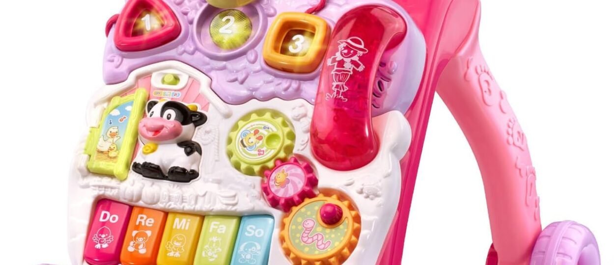 From baby steps to big steps, the Sit-to-Stand Learning Walker by VTech helps your baby develop from a crawler to a walker through adaptive technology. With a barnyard of playful friends to cheer them on, your little one will have endless fun as they learn to walk and learn first words. Start out with the easy-to-remove activity panel for floor play or on-the-run fun, then step it up with the fun-to-maneuver walker and baby standing activity center. Spinning gears, five piano keys, three colorful rollers, three light-up shape sorters, three light-up buttons and a telephone handset offer endless fun that will stimulate your baby’s learning and strengthen little hands and fingers. The baby activity center keeps baby on track by teaching shapes, colors, animals, music and more! Requires 2 AA batteries (included, but new batteries recommended for regular use). Intended for babies and toddlers from 9 months to 3 years old.